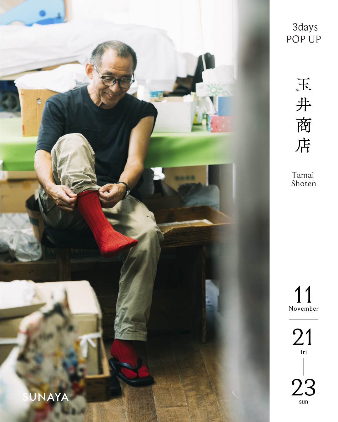 大阪で明治22年創業の足袋メーカー、玉井商店さんをお招きして、11月よりデビューをした新ブランドのお披露目を行います。足袋ソックスや、足袋、その他ポッサムの服飾小物など。初日はブランドの皆様もお越しくださるので、ぜひいろんなお話を楽しんでいただければと思います。