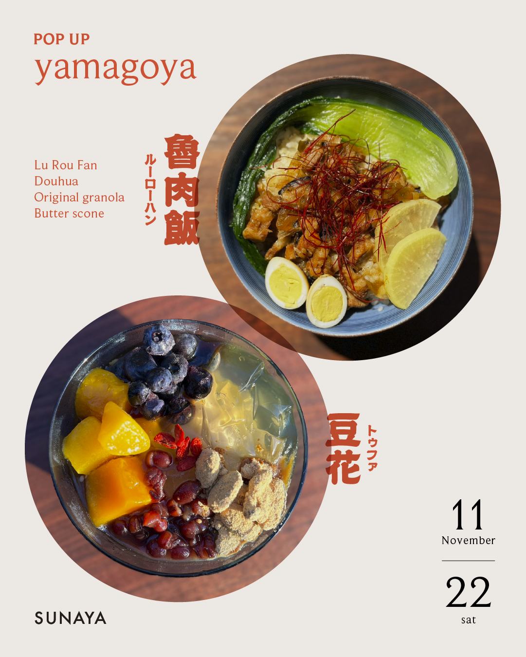 また土曜日には滋賀県草津市で飲食店を営むyamagoyaさんにお越しいただきます!ルーロー飯や豆花のテイクアウト販売予定。スコーンやオリジナルのグラノーラもご用意いただきます。美味しく、やさしいyamagoyaさんの食をぜひお楽しみください。