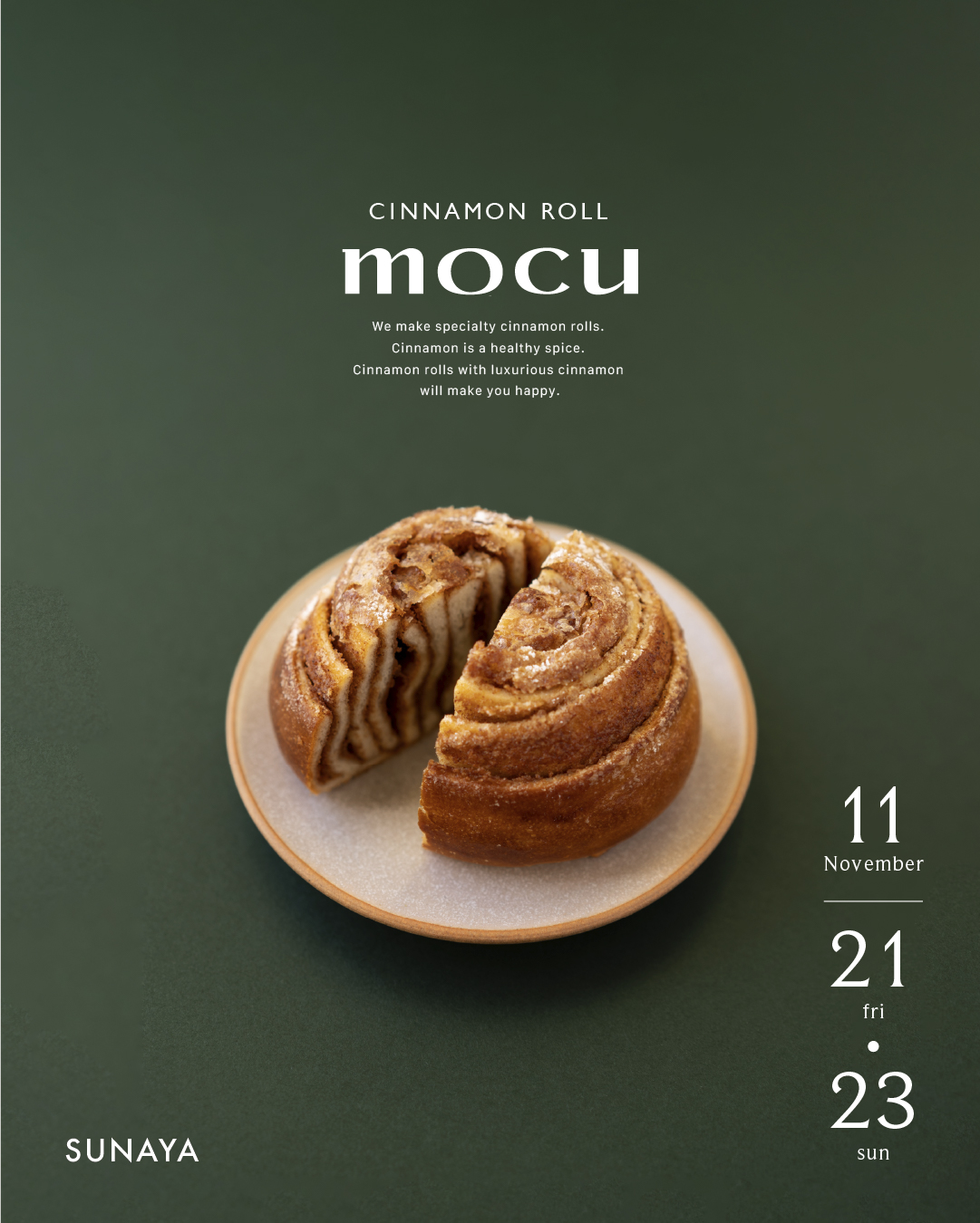 また金曜日と日曜日はmocuのシナモンロールを販売します。私たちがシナモンロールを作り始めてから今年で3年になります。昨年のおもてなしアンヌアーレではmocuの販売で、SUNAYAをスタートさせました。今年は二日間販売をしますので、ぜひお楽しみください。
